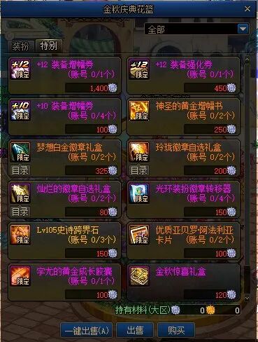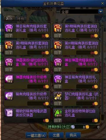 金秋礼包的时装、称号盒子、武器装扮、特色宝珠等道具,记得及时清理库存,12月8日更新后,会被删除,不要浪费了~第二部分:多买多送