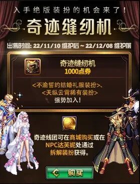 12月8日维护后,奇迹缝纫机也会下架,不过相关时装道具将会在12月22日才会删除,因此相关时装道具也会越来越贵,有需求的勇士记得及时购买,当然也可以等春节礼包~