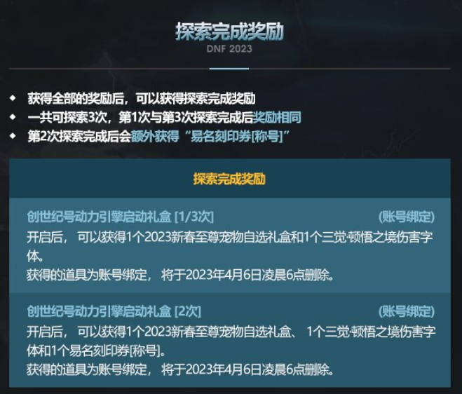 完成探索之后还可以获得探索完成奖励,共可以获得3次,第一次和第三次可以获得2023新春至尊宠物礼盒与三觉·觉悟之境伤害字体。