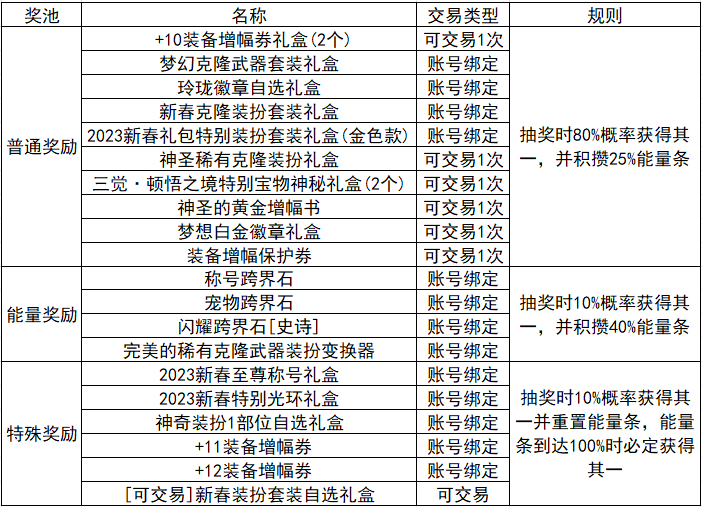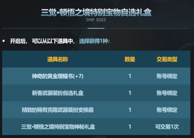 整体的礼包内容与历年相比来说差别并不算太大,主要是在细节的宝珠等部分有属性变化。此外本次宝物神秘礼盒加入到了宝物自选礼盒当中,给予增幅书、武器装扮、稀有克隆武器变换器、宝物神秘礼盒多重选择,每个礼包有两个该道具。