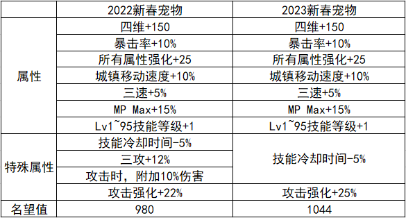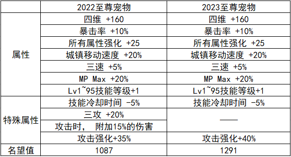 宠物装备属性没有变化,红色的宠物装备看起来比2022少8%三攻,但实际上在属性词条整合优化后,这部分的差距几乎可以算是蚊子腿。