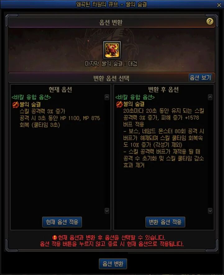 对赋予龙焰属性的巴卡尔融合武器使用时,可转换龙焰属性 - 只转换龙焰属性 - 变换属性时 消耗1个扭曲的魔方 -火焰吐息 -转换属性时,以均等概率获得1种龙焰属性 - 可尝试转换后选择转换前/后属性 - 每尝试转换一次时,属性除外次数增加1次(最多可排除77个) |