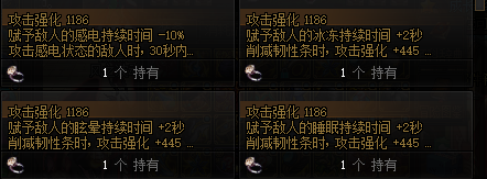 戒指部位的次选词条有:通用词条提升赋予的异常状态持续时间,提升攻击强化。