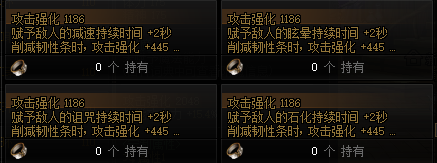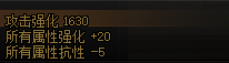 然后是辅助装备除技能攻击力外的低配词条:通用词条全属强提升20属性抗性降低5、全属强提升18、单属强提升20。