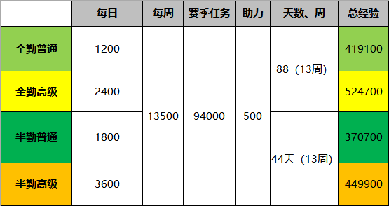※半勤以上一休一进行计算,且以周任务、赛季任务、助力全部完成的情况下所的经验适用。