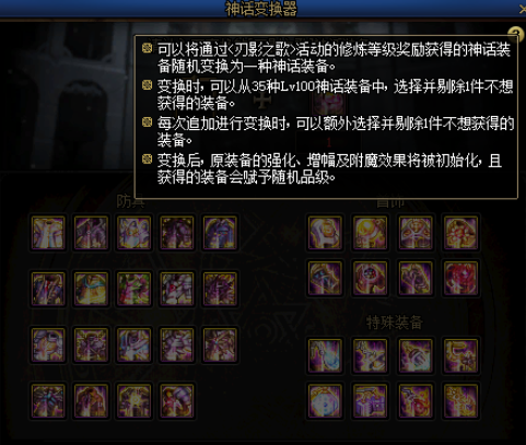 新职业“刃影”预约活动中,有一个专属机制“神话变换器”,如何使用呢?就是放进一件神话,再使用一个材料,就可以将该神话随机变换一次,而为了提高变化几率,每一次变换过程,玩家都可以选择剔除1件不想变换的装备。