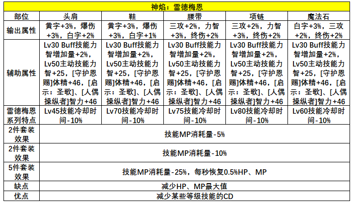 雷德梅恩优点在于减少技能冷却时间,配合护石技能或者是歧路鞋等装备有特别大的提升(强化单一或者个别技能,雷德梅恩可以减少该技能冷却CD,增加该技能使用率)。套装属性无特殊亮点,并且缺点直观,直接降低HP、MP最大值。