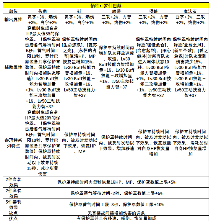 辅助职业选择罗什巴赫鞋+贝利亚斯腰带+泰玛特3件,可以增加技能恢复量以及攻击时可以为队友恢复HP、MP,为队伍创造输出环境。
