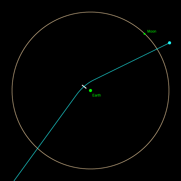 2029年侵入人类领地的“毁神星”。蓝色小点为人造卫星群,黄色轨迹为“毁神星”。NASA