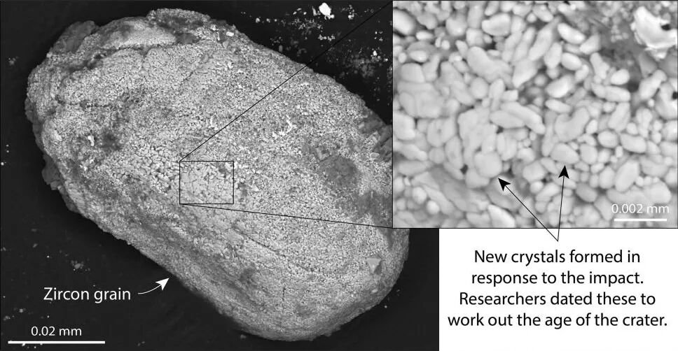 锆石晶体就像是一枚小小的时间胶囊,记录了地球历史上发生过的许多事件。通过分析锆石晶体,科学家计算出了哈瓦沙撞击事件发生的年代。Gavin Kenny / 瑞典自然博物馆