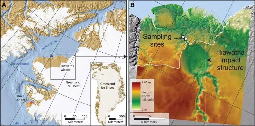 这个埋在冰下的陨石坑名叫“哈瓦沙(Hiawatha)”陨坑,位于格陵兰岛西北角。科学家最初在2018年用机载雷达探测仪发现了它。但是因为陨坑位于体量巨大的冰川下,其形成时间一直没有办法直接测定。