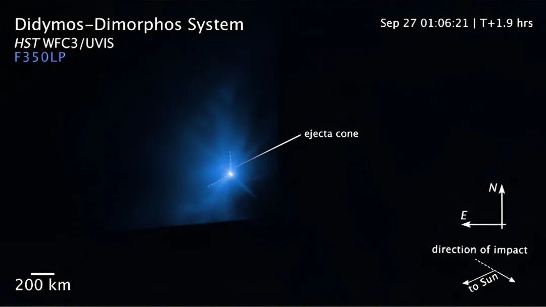 撞击发生后,科学家发现有大量的碎片飞溅而起。最重要的是,他们观测到这颗小行星的飞行参数发生了改变。