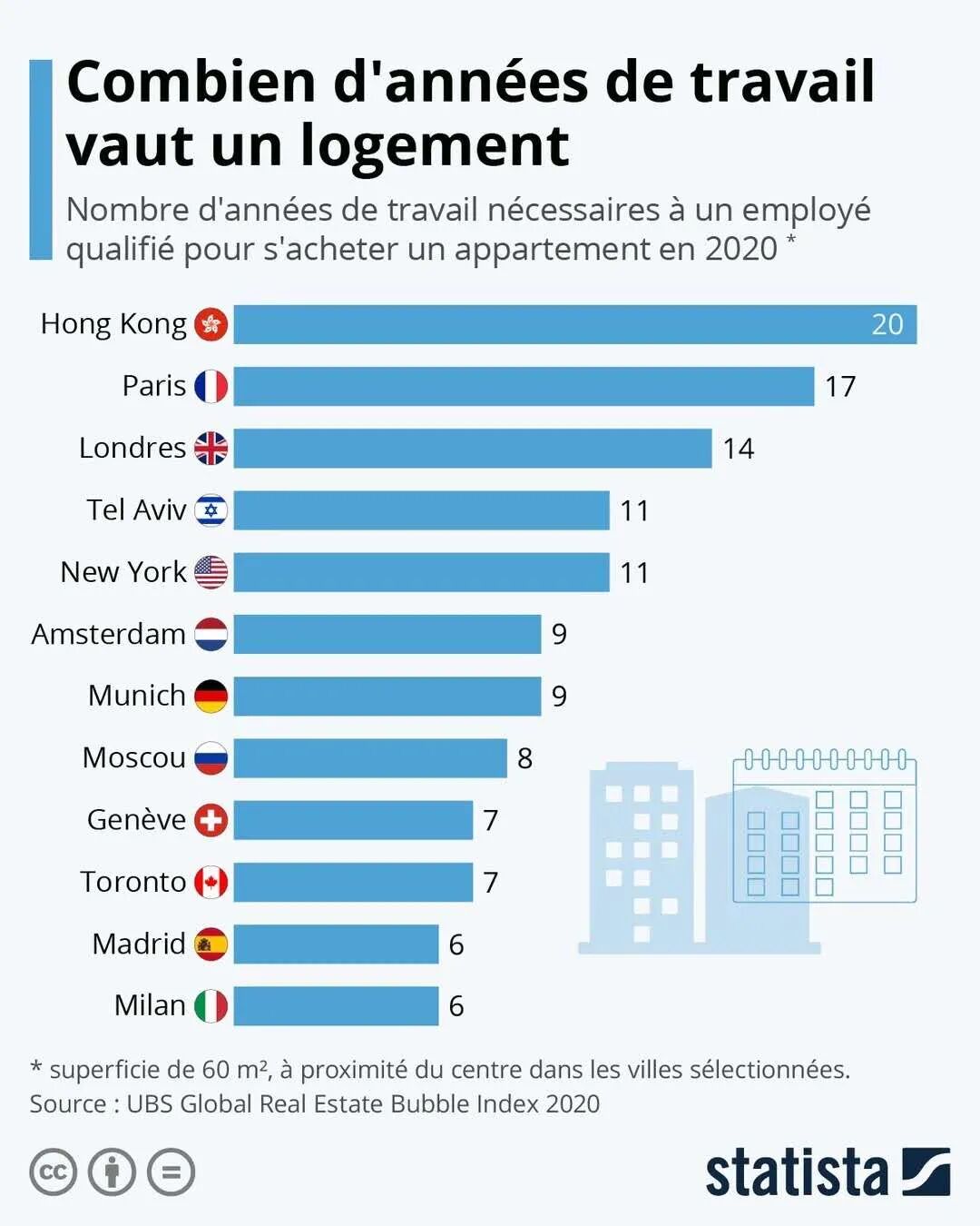 Statista的一项统计显示,以2020年的标准来看,想要在法国巴黎买一套公寓,需要不吃不喝工作17年。