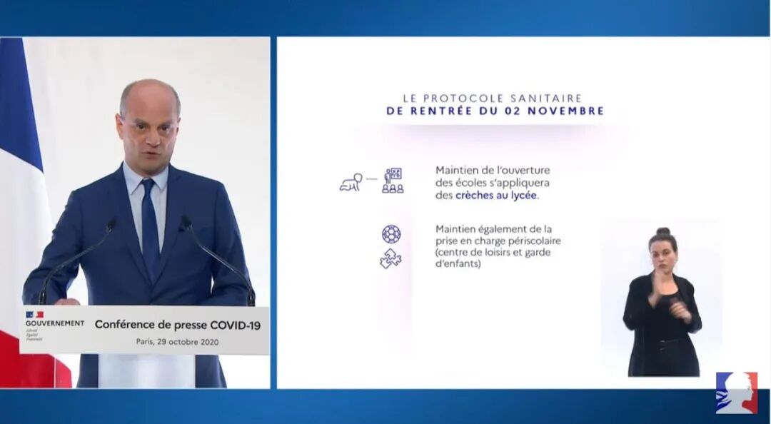 教育部长Blanquer表示,目前,法国有27所学校,293个班级受疫情影响而关闭停课。而在居家隔离期间,幼儿园、小学、初中和高中仍然会继续开放,为了保证校内师生的安全,万圣节过后,全法的学校将会采取更加严格的防疫措施: