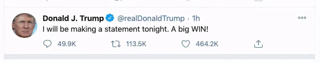 选票还没统计完,懂王本人更是单方面通过推特宣布自己当选新一任美国总统,还召开了新闻发布会庆祝胜利。