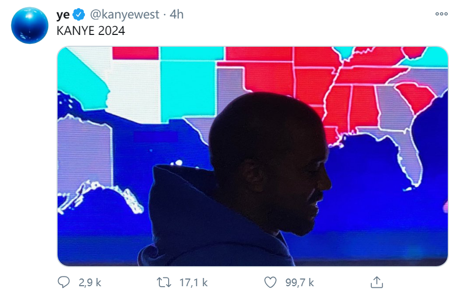 不过侃爷本人并没有气馁,而是立刻通过推特宣布自己将参加2024年美国总统竞选的决定。