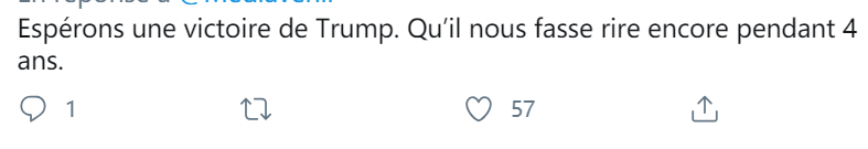 希望特朗普获选。希望他能继续带给我们4年欢乐。