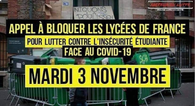 居家隔离期间,除了大学,法国的学校依然保持开放,但是返校之后的学生们却发现校内的卫生防疫条件堪忧。为此,高中生们也是想尽了各种办法。在开学第二天,他们就组织了在全法范围内的“封锁学校”活动,抗议学校开学。