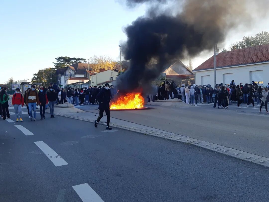 在南特,学生们直接在校门口点起了火。