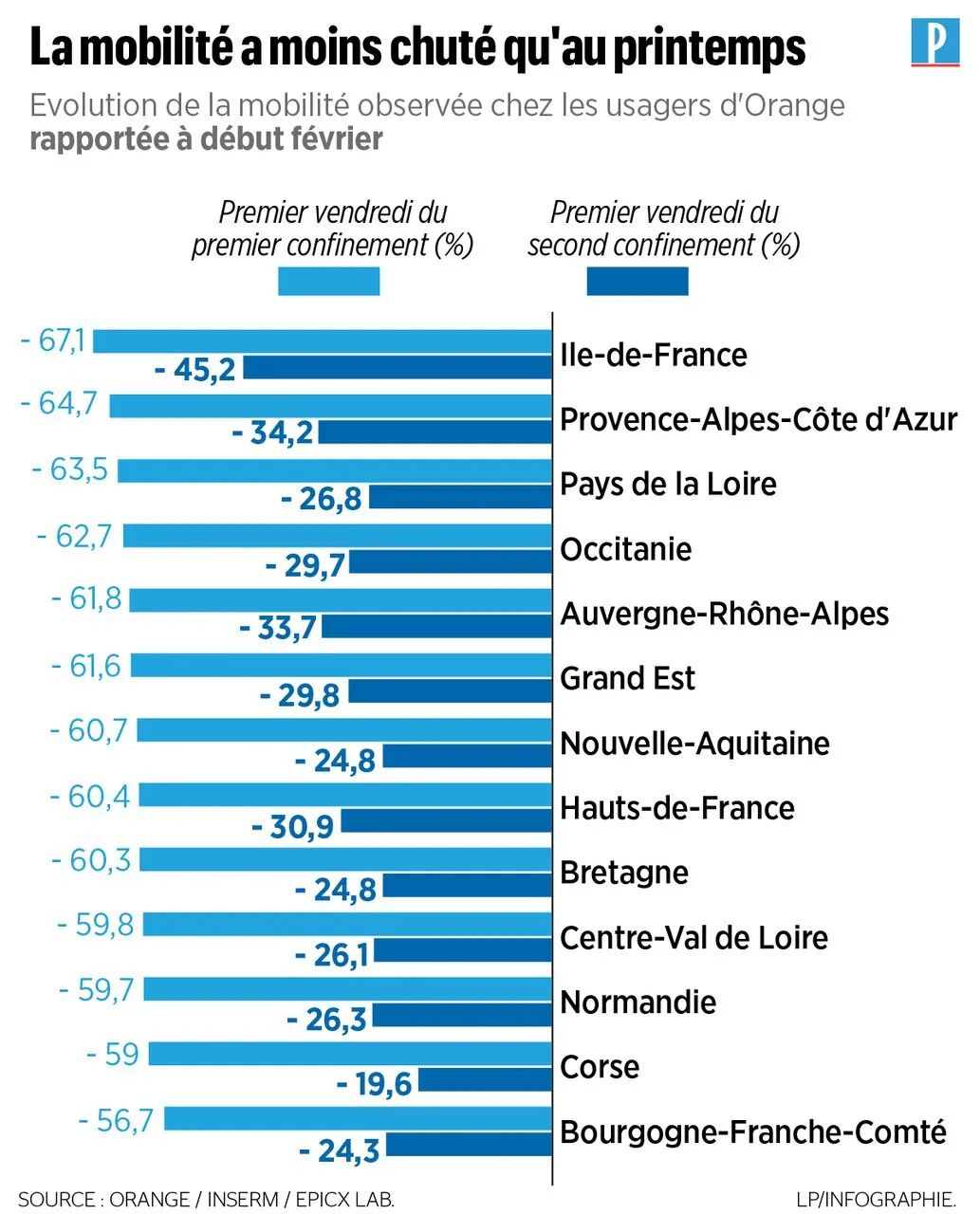 如图:浅蓝为第一次居家隔离期间法国各大区人员出行减少的百分比,深蓝为第二次居家隔离期间人员出行减少的百分比 图源:Le Parisien