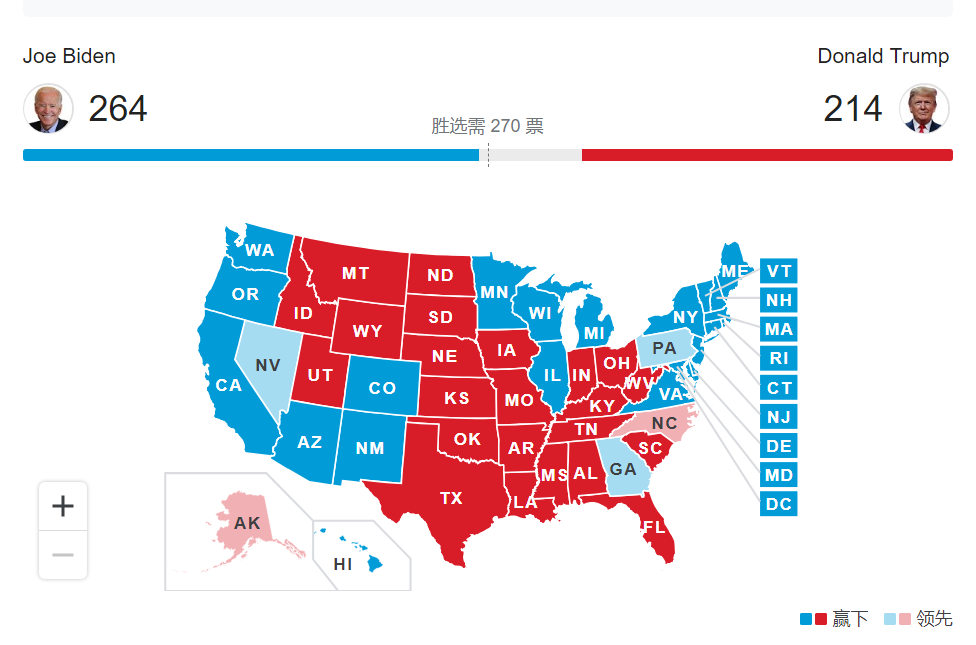 全美选举人票共538张,获得270张选票的总统候选人即可赢得大选。目前,拜登获得了264张选举人票,特朗普则获得了214张选票。看来特朗普连任希望渺茫,而他的竞选团队则公开宣布“选举还没有结束”,不知道后面又会展开怎样神奇的剧情呢?