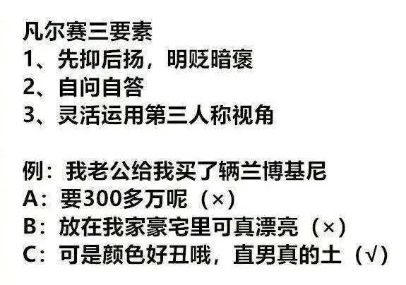 因此,凡学创始人小奶球在定义“凡尔赛文学”的具体表现形式时,还提出了著名的“凡学三要素”理论。