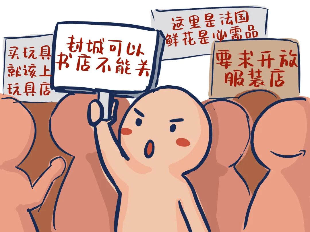 非必需品店的店主们不干了,决定集体游行抗议,要求政府允许他们和超市一样正常营业。