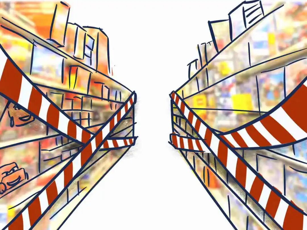 一夜之间,超市里的玩具、书、化妆品全都成了禁忌品,货架前拉起了围栏。