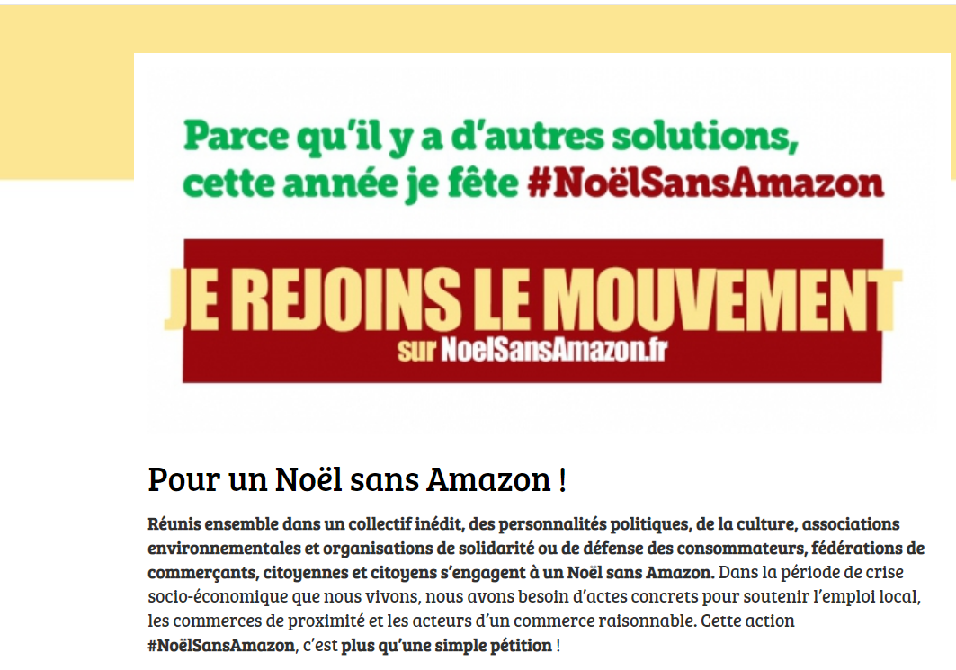 然而就在最近,电商巨头亚马逊却被法国一众政客和协会联合抵制,他们还发起了一项名为#没有亚马逊的圣诞节(Noël sans Amazon)的活动,呼吁全体法国人一起抵制亚马逊,不要使用亚马逊提供的任何服务?