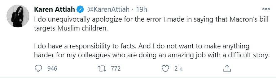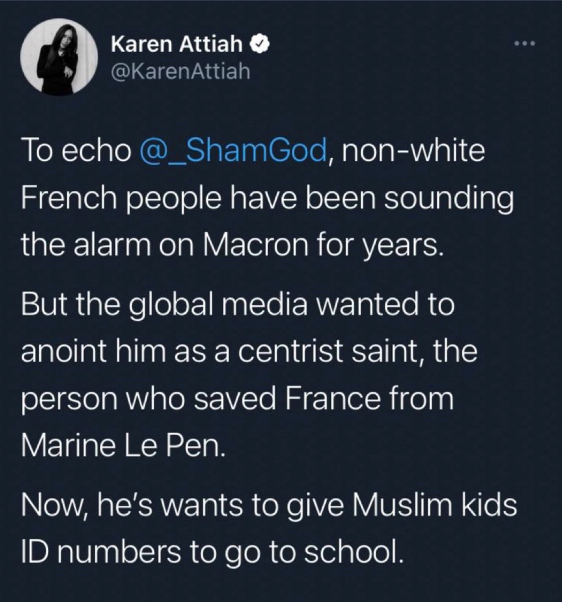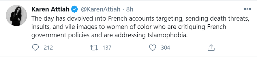 随后她又通过推特表示,自己虽然未经查证就发布了假消息,但是作为一名有色人种女性,因为批评法国政府,探讨法国人的“伊斯兰恐惧症”,就遭受了法国网友的网络攻击,这就是法国网友的不对了。