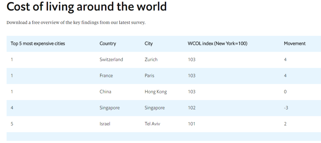 11月18日,英国《经济学人》智库(Economist Intelligence Unit)发布了《2020年全球生活成本调查》(Worldwide Living Cost 2020)。
