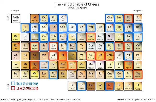 从这张汇集了几百种奶酪的周期表中,虽然没有明确分离出英国和法国奶酪,但是可以根据每个元素块右上角的国家标识来推断出英国和法国奶酪的整体差异。