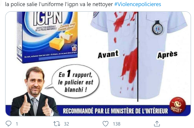 法国内政部长Darmanin随后通过推特要求警局尽快停职3名涉事警察并展开调查。随后,他也通过电视采访强调,视频中警察的行为“卑劣且不可容忍”,如果司法部门调查之后认为3人行为不当,他们会立即被开除。然而,作为管辖法国警方的内政部长,Darmanin的话并不能安抚大家的怒火,#Darmanin下台(DarmaninDémisson)更是再一次成为了法国推特的热门话题。
