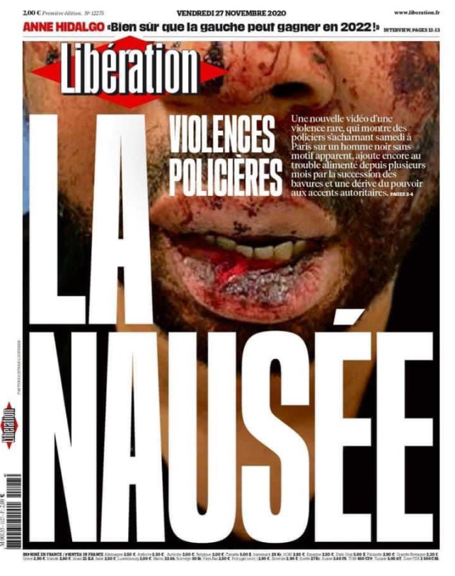 视频和图片随后引起了轩然大波,而法国总统马克龙也表示对这段视频“十分震惊”。Michel被殴打之后满脸是血的照片甚至还被法国解放报放在了头版。