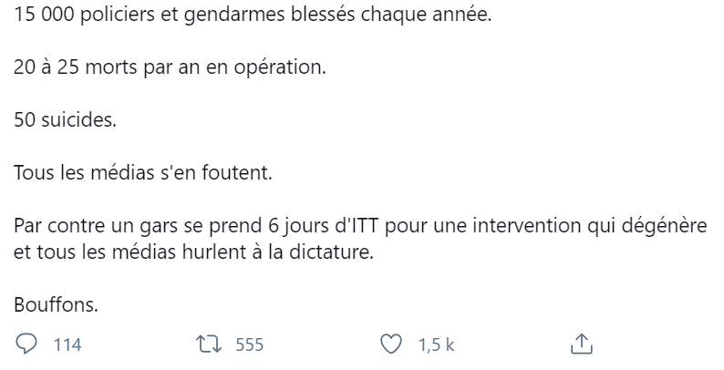 每年有15000名警察受伤,20-25人在行动中牺牲,50人自杀,但是媒体并不关心这些。反倒是在一次并不严重的意外事件面前,他们又开始批评警察专横独裁了。
