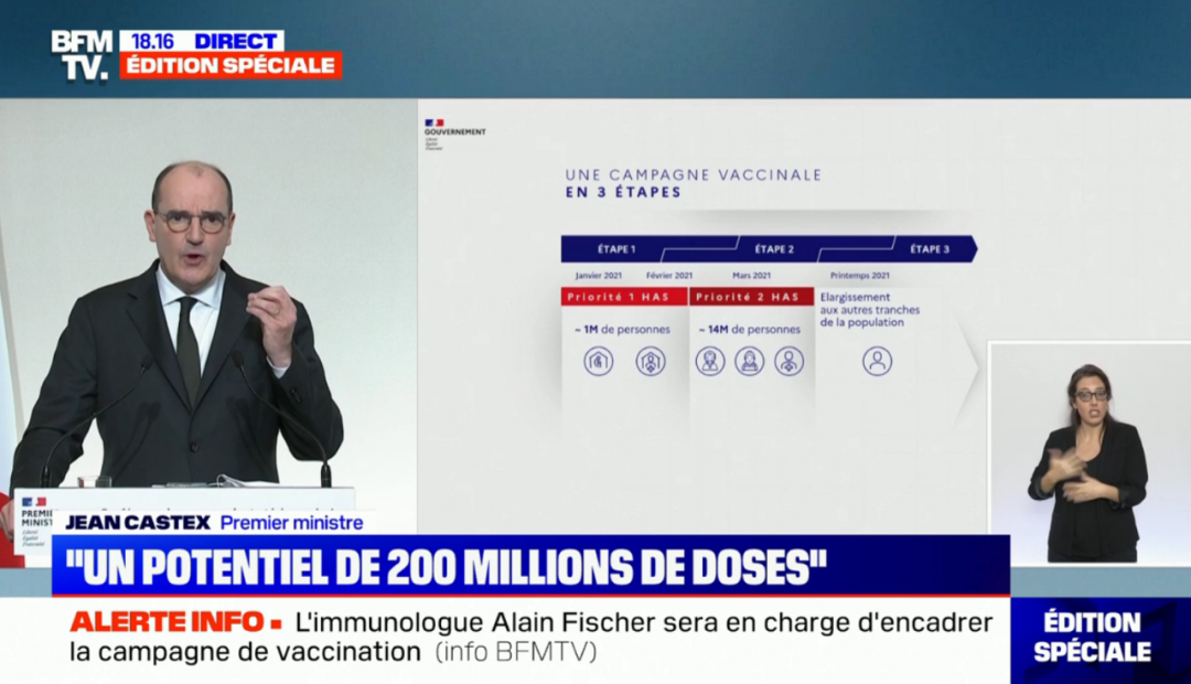 而在法国,新冠疫苗也是大家最关注的话题。12月3日晚,法国总理卡斯泰向大家宣布了法国的疫苗接种政策。