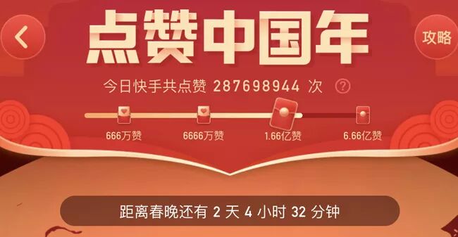作为春节联欢晚会的独家互动合作伙伴,今年的快手也加码了现金红包金额,除夕当晚快手将发出春晚史上金额最大的10亿现金红包。从北京时间1月24日晚8点到25日凌晨,快手将推出5轮抢红包活动,其中包括221万个“锦鲤红包”,金额从66.6元至2020元不等。