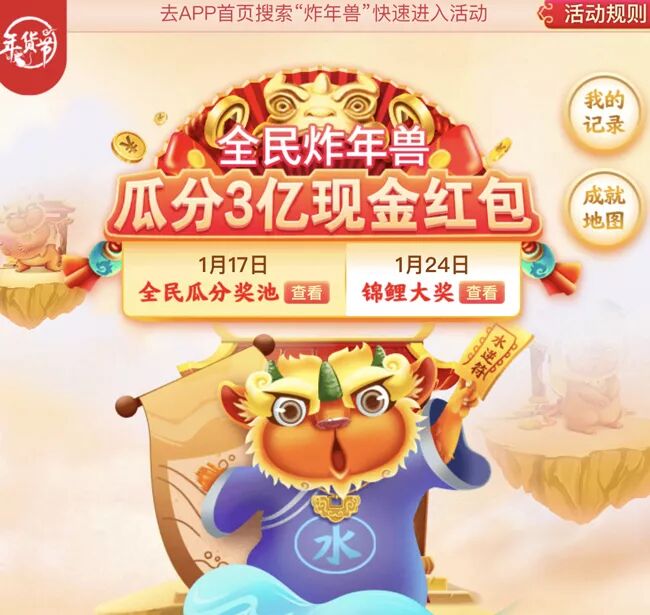 2、“全民炸年兽”:在1月1日至26日期间做任务领爆竹,领完爆竹就炸年兽。每关有不同的年兽,关卡越高,所需炸年兽的爆竹就越多。每过一关,就会收到几毛钱的现金红包,购物时直接抵扣。1月17日至23日10点,可以开始挑战终极年兽,挑战成功就可以得到全年躺赚奖、全年免单奖、清空购物车等终极大奖。