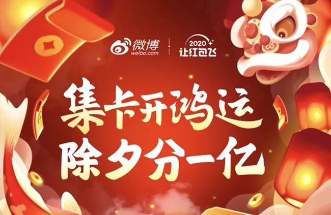 1、第一阶段:1月9日-1月24日的“集卡开鸿运,除夕分一亿”。用户只要集齐6种开运卡,就可以在除夕兑换鸿运红包,最高金额2020元。网友只要上微博签到、刷微博、看视频、加关注、邀好友便能轻松集齐上述六类开运卡。