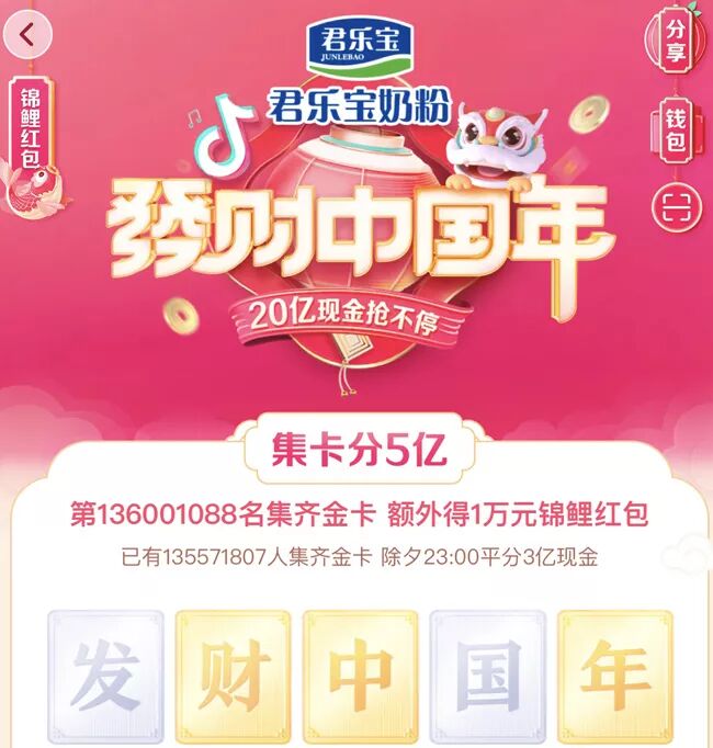 4、1万个万元锦鲤红包:用户完成集卡或红包大会等活动,即有机会参与抽取。此外,还有登录见面礼、邀请好友拆红包等经典玩法。
