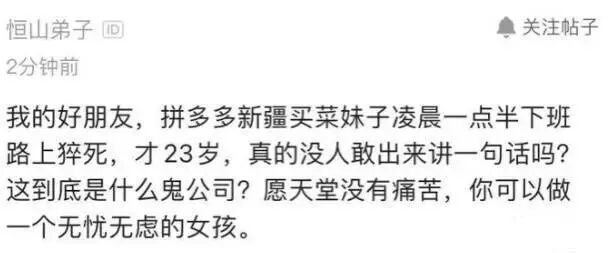 这是一位年仅22岁的花季少女,她2019年7月以管培生的身份入职拼多多,之后从上海被调岗到新疆。“肺宝为多多守边疆”——这是她被强制调到新疆后,在公司内部通讯软件上留下的签名。润肺,是她给自己起的昵称,取自本名的谐音。不幸的是,润肺最终没能成为公司的守疆人,而是将自己生命的最后一刻停留在了加班回家的路上。