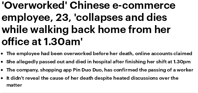 每日邮报:负荷工作的23岁中国电商女员工,凌晨1点半倒在了从办公室回家的路上