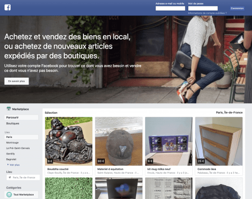 Facebook上的“Market place(同城二手交易)”也是一个选择。商品分类也很全,和leboncoin其实非常类似。相比leboncoin来说,作为社交平台的Facebook有一个很大的优点就是能够“智能分类”,并且根据你的兴趣和数据给你推荐一些商品。买家与卖家也可以直接通过imessenger交流,也是很方便的。但是,也有很多诈骗信息,小伙伴们一定要注意!
