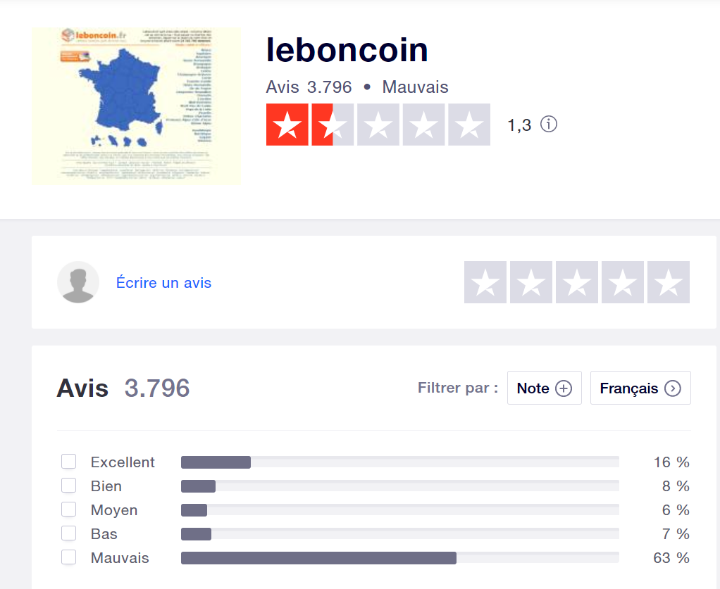 不过,虽然leboncoin在法国的浏览量非常高,网站每月的点击量可达2800万,不少的法国人却表示,网站的用户体验真的太差了!leboncoin在某消费者评分网站上的分数竟然只有1.3分!