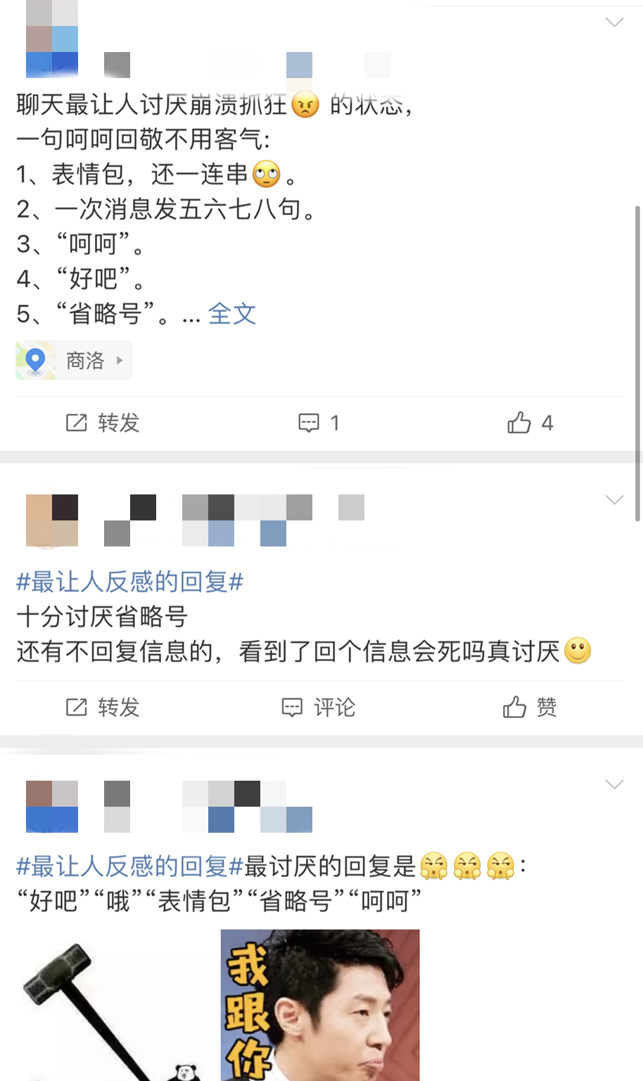 有的时候,“…”表达的不是感情,而是一种态度。有些人在不好意思直接表达不同意见时,就会用这个符号。心理学家Vanessa Lalo解释:“在聊天的过程中为了不破坏和谐气氛,人们会通过省略号来表示‘婉拒’。这是一种非暴力的交流方式,因为你既可以表态自己的不同观点,也不用担心对方因为没有回应你的态度而生气或指责对方。”
