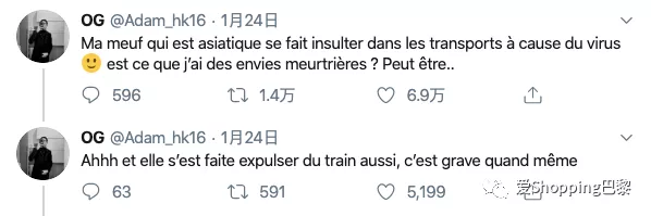 1月25日就有法国网友情绪激动地在推特上发文称,他的亚裔妻子因为戴口罩乘车而被吐口水并且被赶下列车。