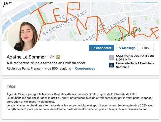 豁出去的她决定,在巴黎市区沿着她所有就读过的大学奔跑了20公里,活生生在地图上跑出了一个“alternance”字样,并将截图放在了自己的LinkedIn主页上,并解释这样做的动机,希望通过此举吸引雇主的注意。