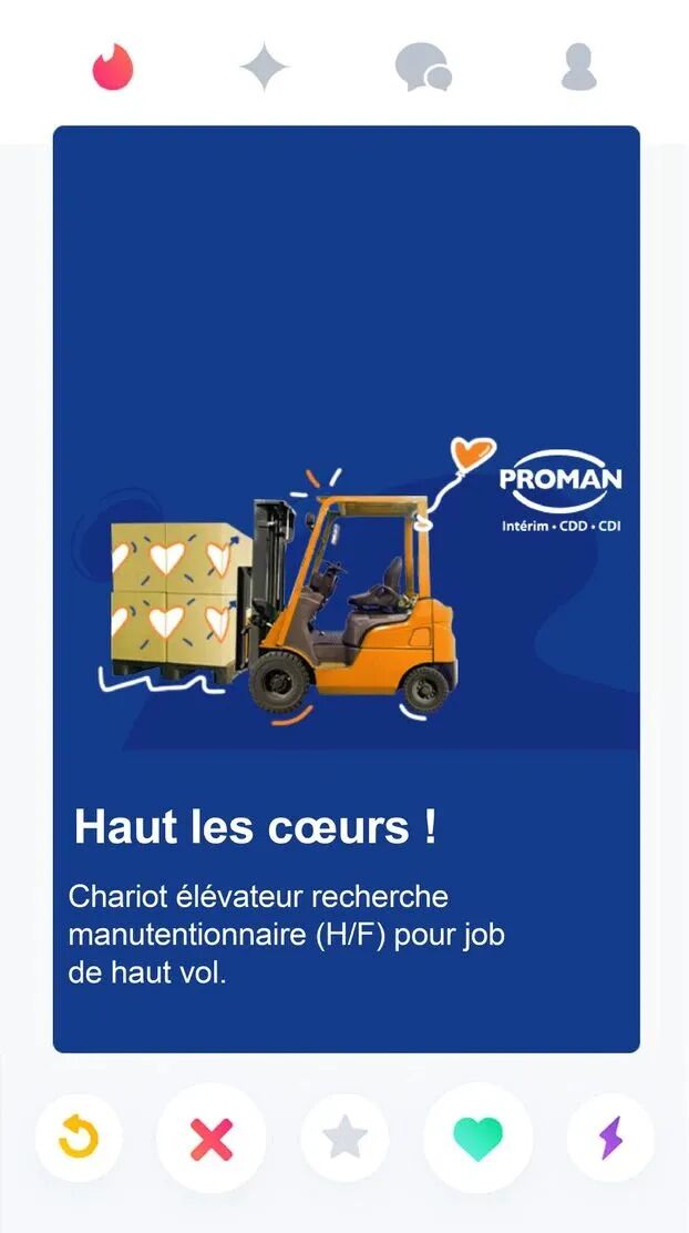 疫情期间,由于大家缺少“面对面”的社交活动,各大约会、交友网站在法国的浏览量急速上升,Tinder也是其中之一。招聘网站Proman则是充分利用这个机会,和Tinder展开了合作。