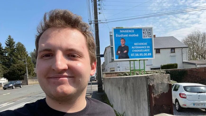 上个月,一名信息科技专业的学生Maxence也遇到了同样的困境。为了吸引雇主的注意,这位男孩想出的办法也很“绝”。他用自己打工送外卖挣来的钱,租下了悬挂在公路上的5个4米乘3米巨幅广告位,刊登自己的求职信息。
