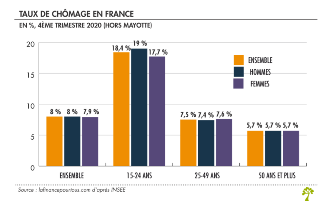 根据INSEE上个月发布的一项数据,法兰西岛(île-de-France)在2020年一共失去了10万个工作岗位。截止2020年第四季度,法国共有240万名失业者,失业率达到了8.0%。在失业人群中,15-24岁的年轻人所占比例是最高的,达到了18.4%。